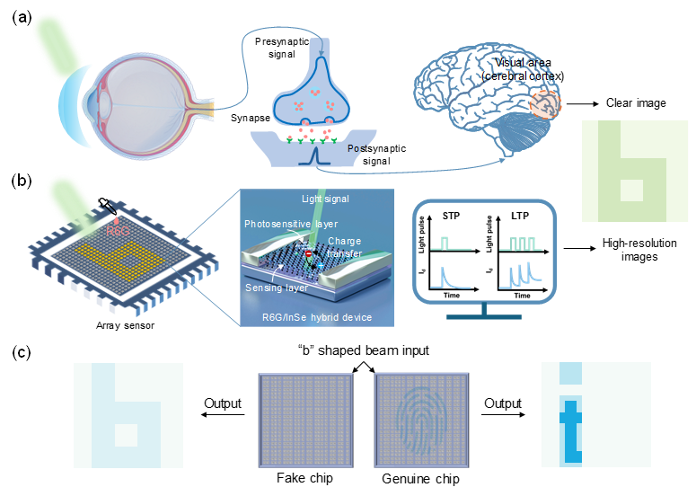 研究团队设计了一种R6G/InSe混合器件结构,并利用SERS验证了该结构中的电荷转移机制。这种结构有效地模拟了生物突触,包括突触前膜(R6G光敏层)、突触间隙(R6G/InSe界面)和突触后膜(InSe传感层)。该结构中的电荷转移过程与神经递质在突触间隙中的传递过程非常相似。团队利用表面处理技术来调节电荷转移过程,从而开发出基于双重加密的片上防伪应用。
