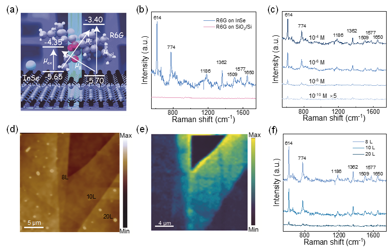 二维InSe具有原子级平整界面和高表面活性,有利于探针分子的吸附,为实现电荷转移机制SERS提供了有力条件。InSe表现出优秀的SERS性能,能够实现对R6G探针分子拉曼信号的有效增强,最低检测浓度可达10-10 mol/L。吸附在2D InSe表面上的探针分子在光照下发生光诱导电荷转移。这种电荷转移改变了分子极化率,增加了探针分子的拉曼散射截面,从而放大了拉曼信号。