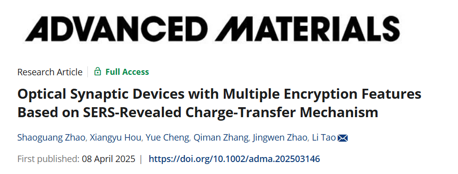 近日,350vip8888新葡的京集团姚裕贵教授团队成员陶立教授课题组在Advanced Materials发表了一项重要研究成果,题为“Optical synaptic devices with multiple encryption features based on SERS-revealed charge-transfer mechanism”。具有原子级厚度的二维材料光学突触器件表现出构建高度集成的可调谐人工视觉神经网络的潜力。然而,原子级厚度也会导致光吸收较弱,限制了器件的光电性能。该研究提出的罗丹明6G染料(R6G)/InSe杂化结构器件展现了优异的光响应及光电突触性质,并从光谱学和光电子器件两种视角,证明了染料分子和二维InSe之间的电荷转移机制。通过表面处理有效调控了电荷转移的过程,并基于此实现了双重光学加密防伪应用。