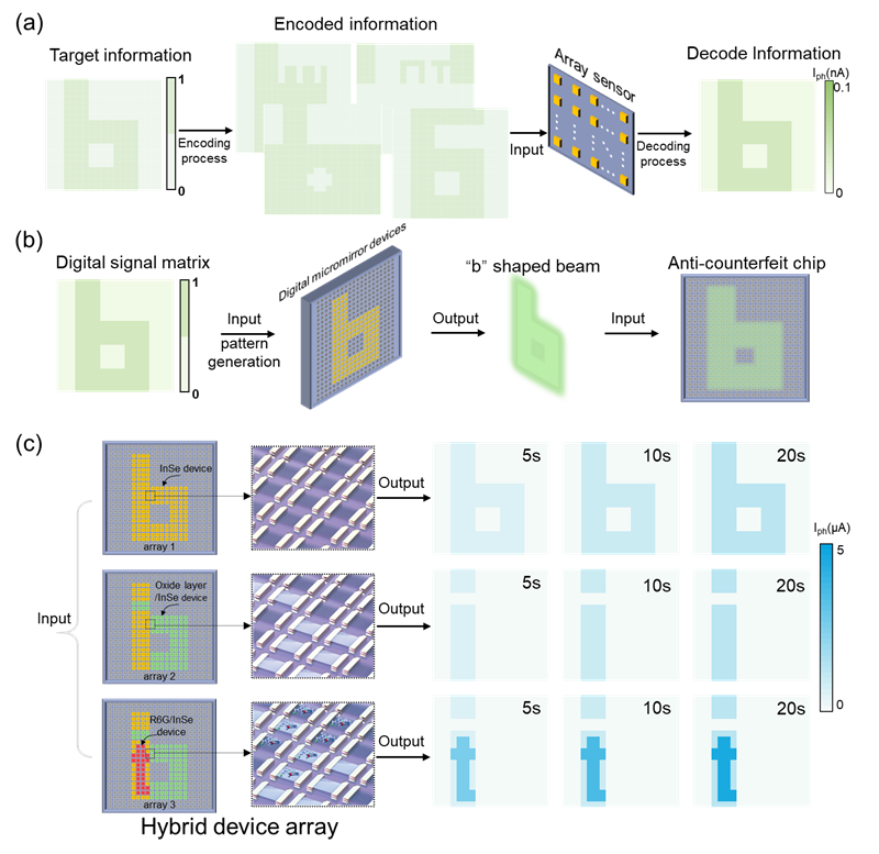 通过人为的引入噪声,可以对需要隐藏的信息进行加密处理。通过引入背景噪声,可将真实信息隐藏在多张具有噪声背景的图像中。利用混合结构器件的图像降噪功能,将被噪声背景隐藏的真实信息解密。根据解密得到的特定形状的数值矩阵,生成特定形状(字母“b”)的光束用于防伪阵列的验证。通过表面处理技术,可以对R6G/InSe混合结构器件中的电荷转移过程进行调控,使得器件对相同光刺激产生不同的光响应。利用这一特点,团队设计了加密防伪阵列。阵列中包含了精心设计的三种类型的InSe器件(纯InSe器件,R6G/InSe器件以及氧化层/InSe器件)组成特定的图案。由于器件之间光响应及突触性能的差异,当用于验证芯片真伪的“b”形光束照射到阵列表面时,正版芯片会显示出字母“i”或字母“i,t”。而盗版芯片由于没有表面处理,仅能显示出字母“b”。团队提出的应用方案,通过编码的检测光束形状和芯片设计实现双重加密,在片上防伪方面显示出广阔的应用前景。在实际应用中,R6G的掺杂浓度可作为一个额外的调控参数,提供独特的指纹信息,进一步提升设计芯片的防伪安全性。